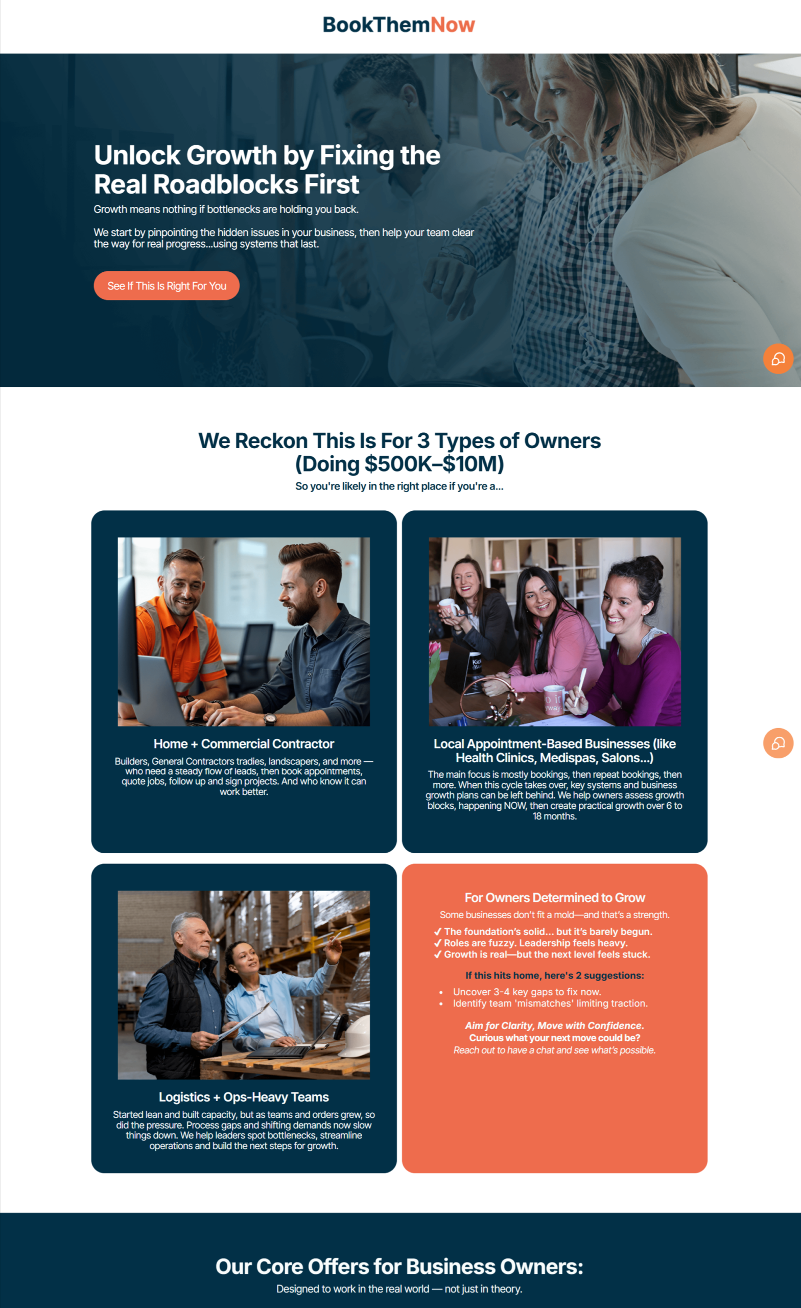 Book Them Now helps small to mid-sized businesses ($500K-$10M) identify operational bottlenecks and implement systems for sustainable growth.